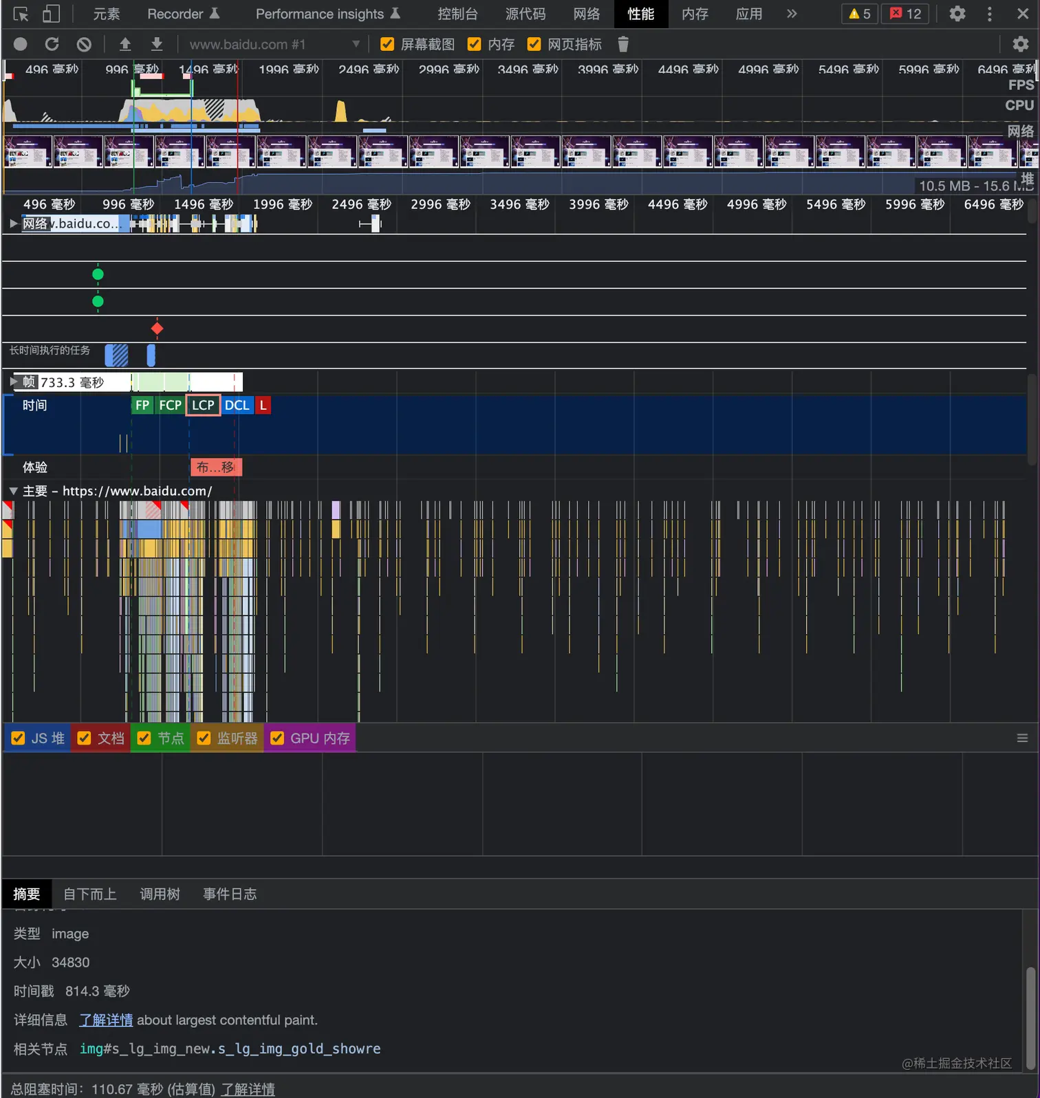 Chrome 的 Performance 页签算是最基础的性能测试工具了,但是其只是给出了部分指标,像 FID、CLS 这样的核心指标无法在此获得。