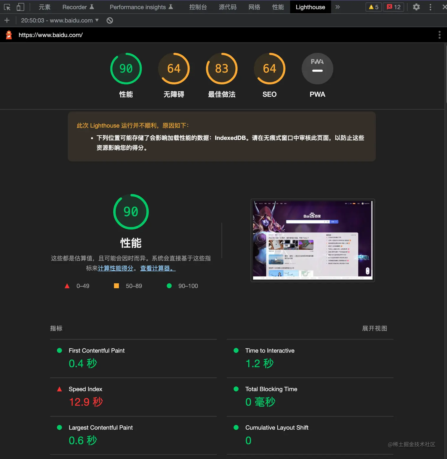 Lighthouse 是一个 Chrome 插件,可以帮助我们很好地测量页面的性能指标,顺手测了一下百度的指标,如下图所示: